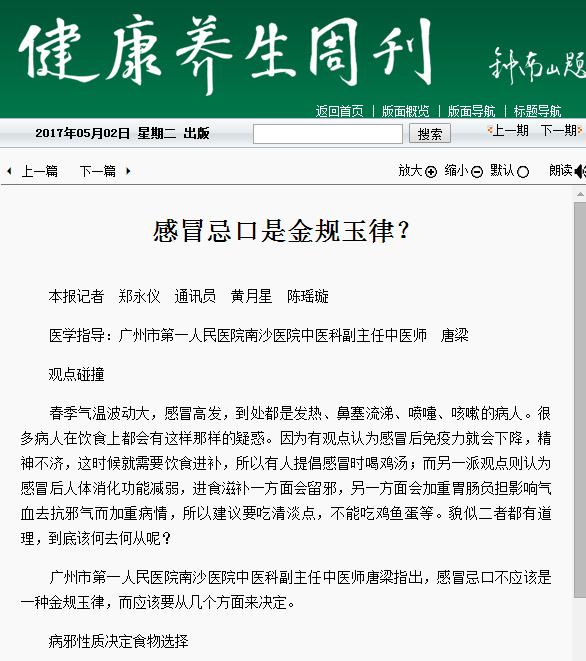 《健康养生周刊》:感冒忌口是金规玉律? 2017年5月2日B02版