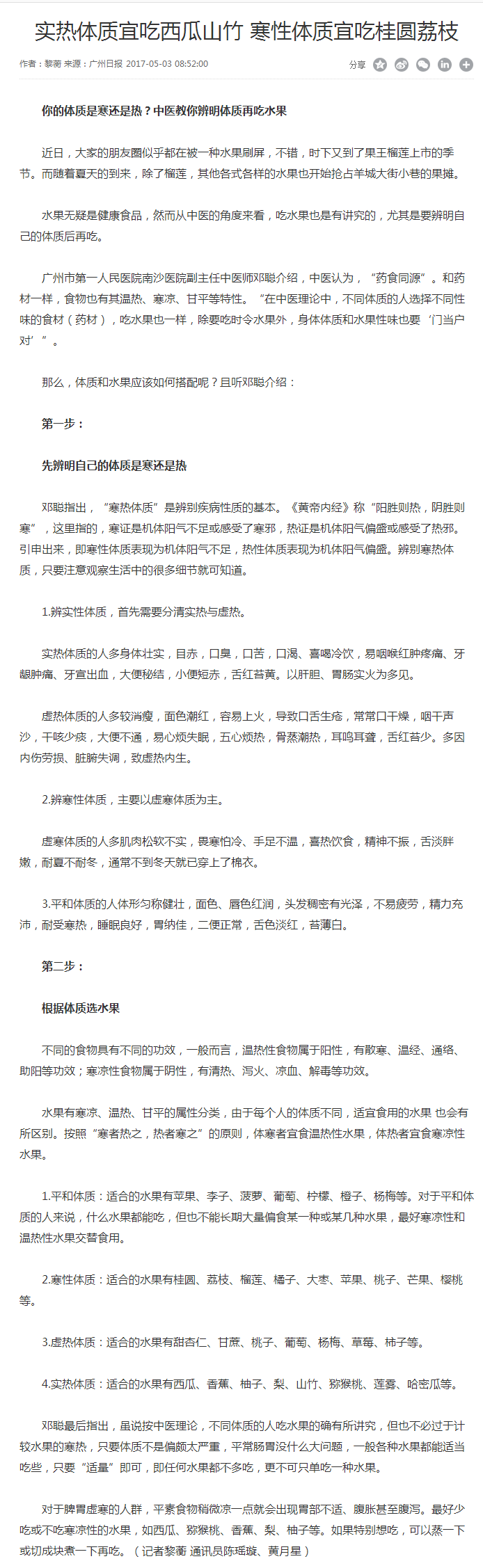 《广州日报》:实热体质宜吃西瓜山竹 寒性体质宜吃桂圆荔枝 2017年5月3日A17版
