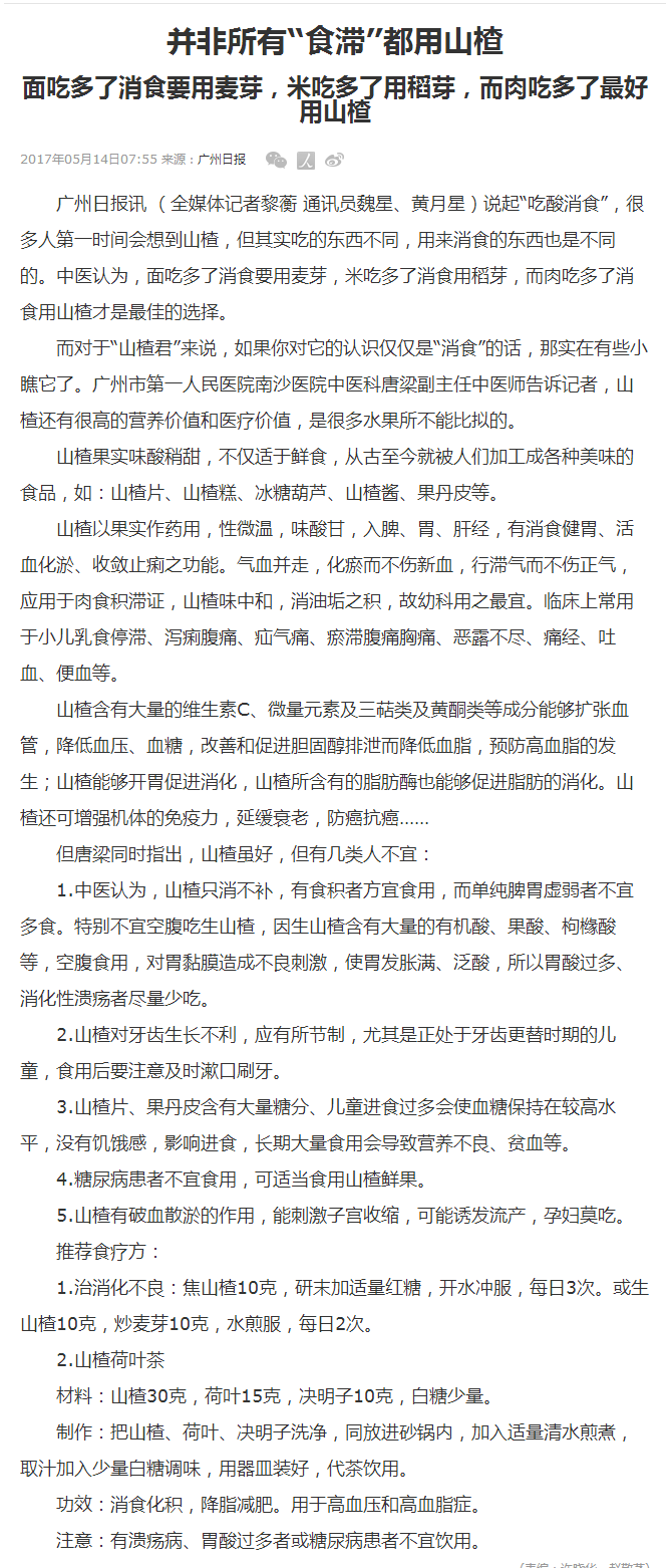《广州日报》:并非所有“食滞”都用山楂 2017年5月14日A12
