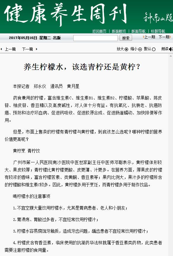 《健康养生周刊》:养生柠檬水,该选青柠还是黄柠? 2017年5月16日A02版