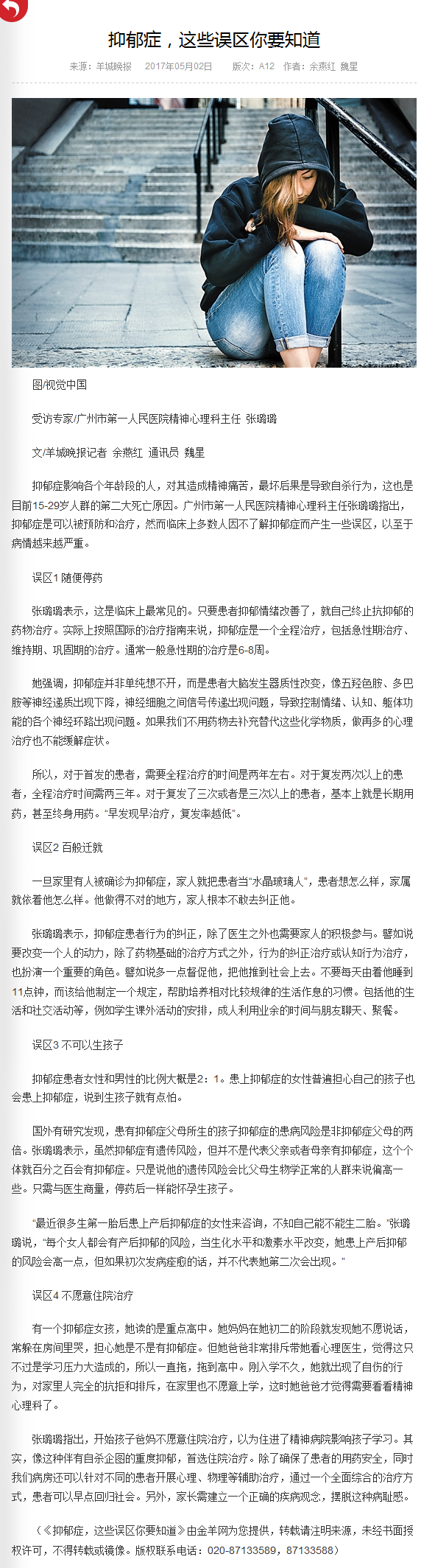 《羊城晚报》:抑郁症,这些误区你要知道 2017年5月2日A12版