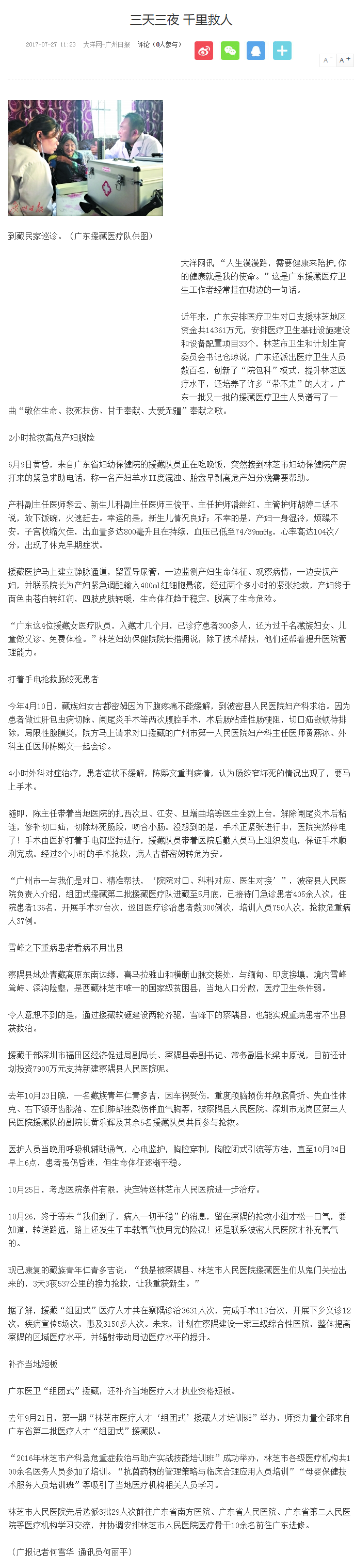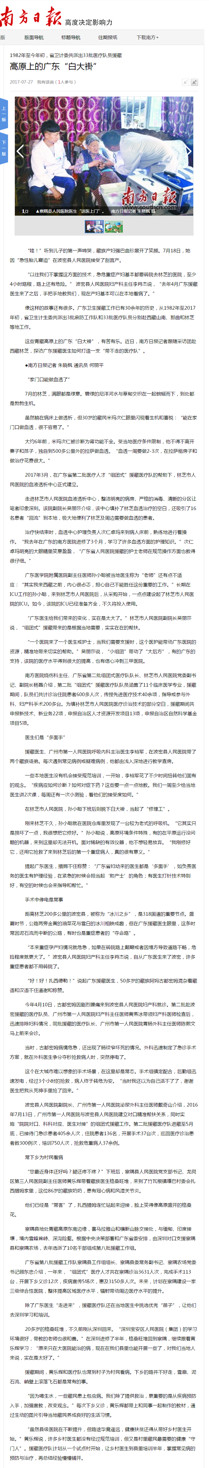 《南方日报》:高原上的广东“白大褂” 2017年7月27日A15版