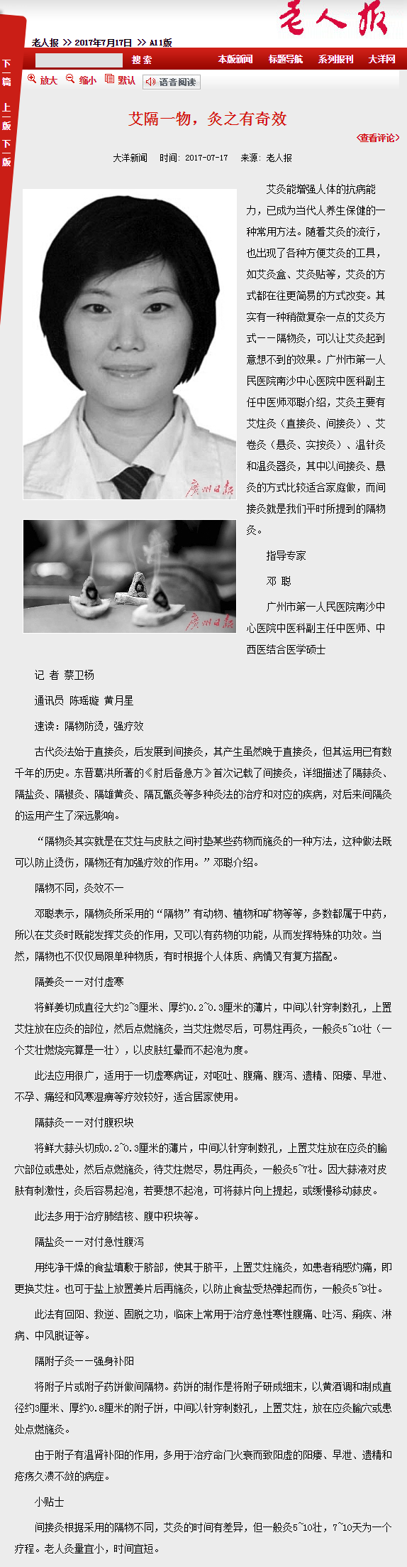 《老人报》:艾隔一物,灸之有奇效 2017年7月17日A11版