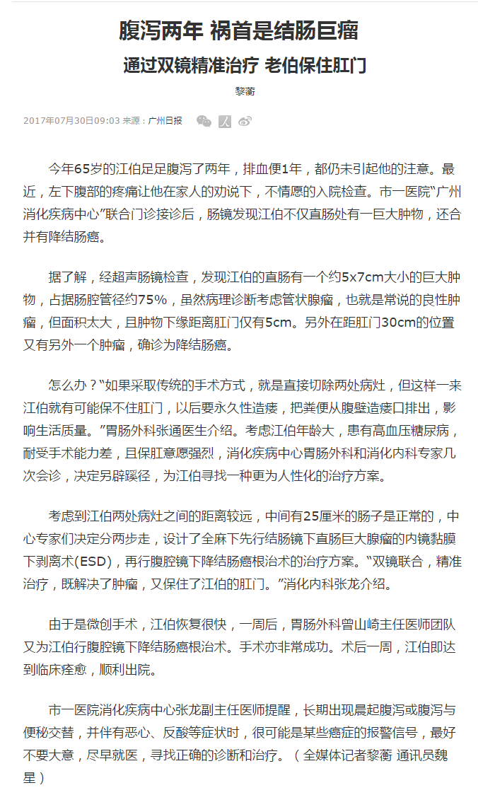 《广州日报》:腹泻两年,祸首是结肠巨瘤 2017年7月30日A11版