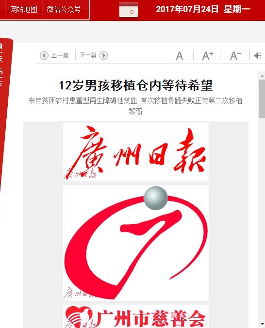 《广州日报》:12岁男孩移植舱内等待希望 2017年7月24日A17版