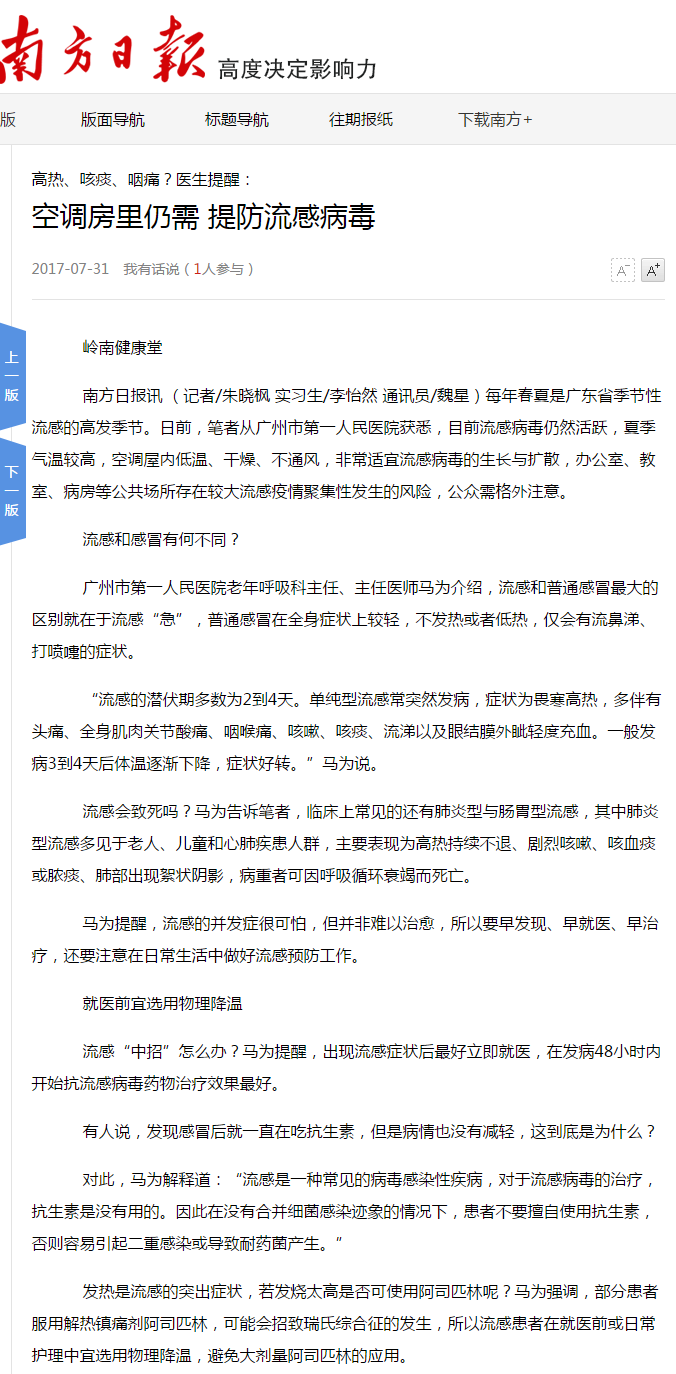 《南方日报》:空调房里仍需 提防流感病毒 2017年7月31日A11版