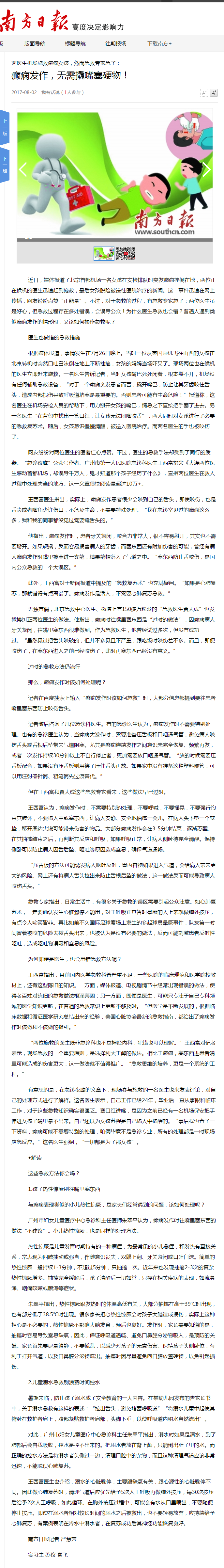 《南方日报》:癫痫发作,无需撬嘴塞硬物!2017年8月2日B01版