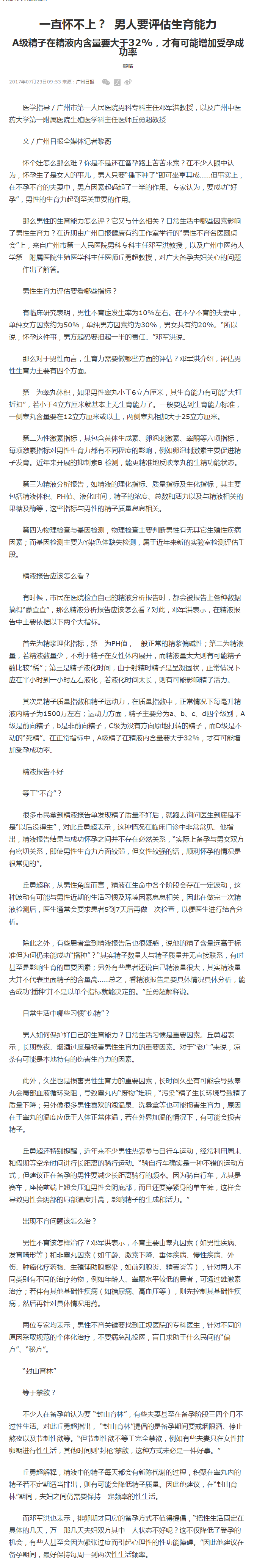 《广州日报》:一直怀不上?男人要评估生育能力 2017年7月23日A12版