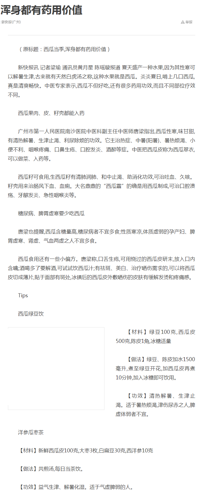《新快报》:西瓜当季 浑身都有药用价值 2017年7月25日A29版
