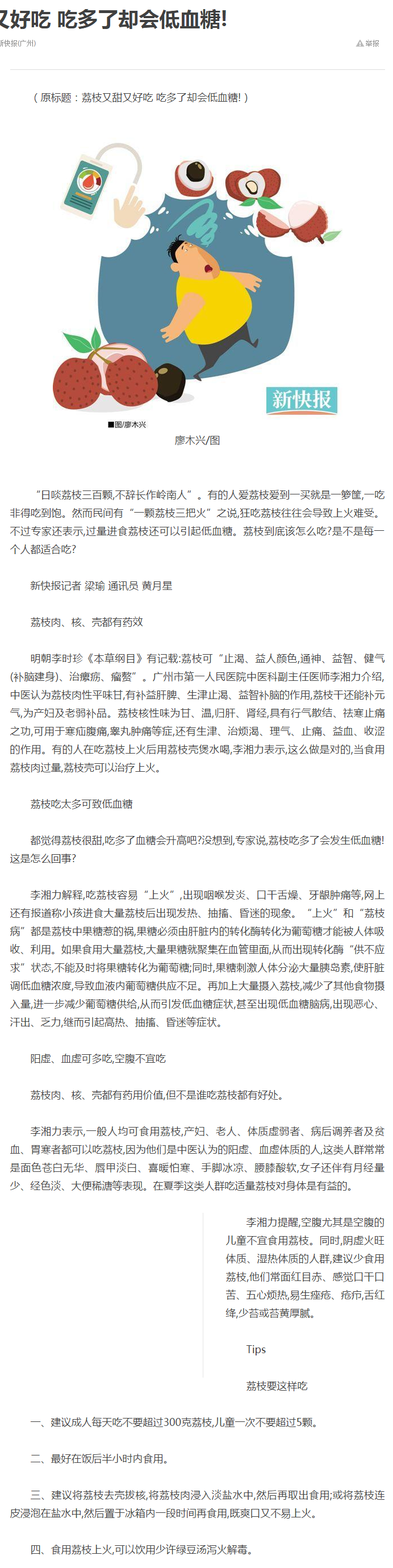 《新快报》:荔枝又甜又好吃 吃多了却会低血糖 2017年7月25日A29版