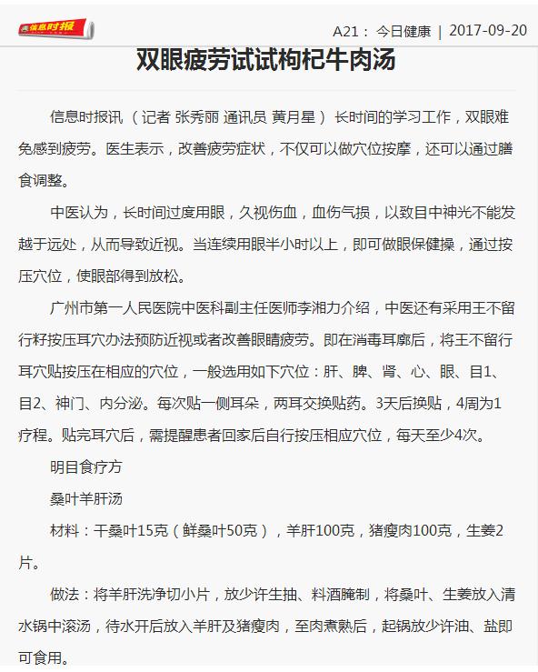 《信息时报》:双眼疲劳试试枸杞牛肉汤 2017年9月20日A21版