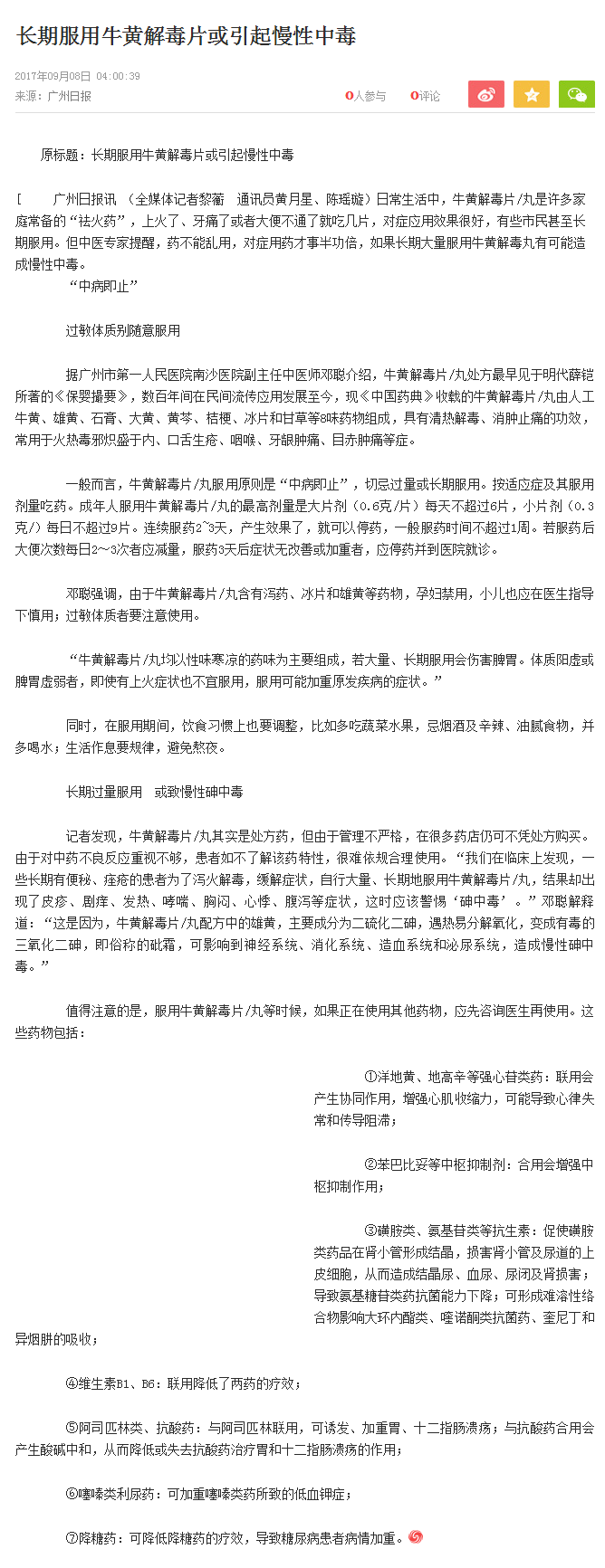 《广州日报》:长期服用牛黄解毒片或引起慢性中毒 2017年9月8日A20版