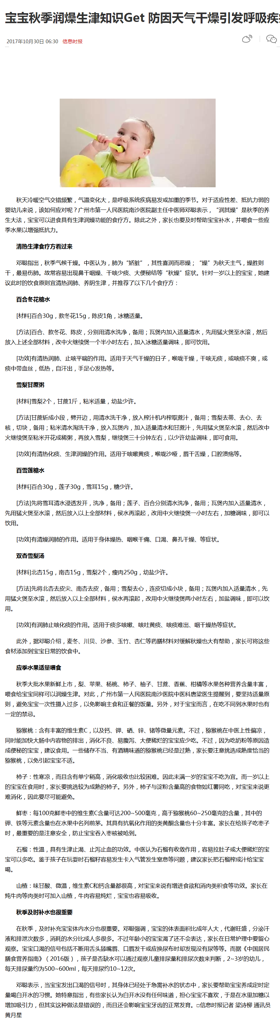 《信息时报》:宝宝秋季润燥生津知识Get 防因天气干燥引发呼吸疾病 2017年10月30日