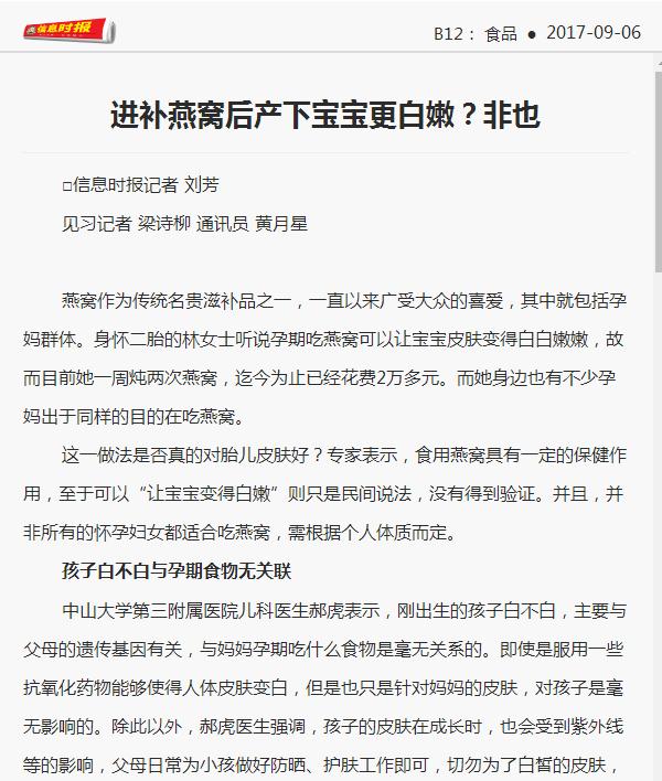 《信息时报》:进补燕窝后产下宝宝更白嫩?非也 2017年9月6日B12版