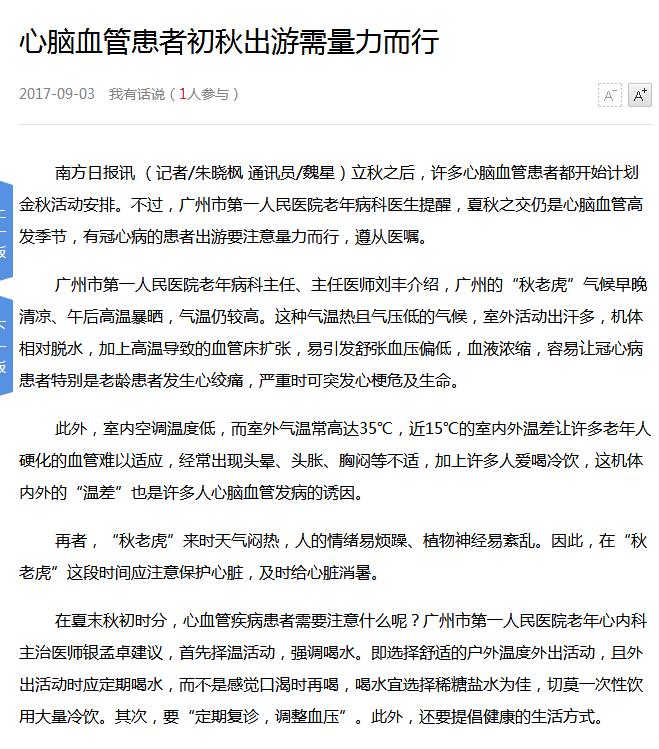《南方日报》:心脑血管患者初秋出游需量力而行 2017年9月3日A06版