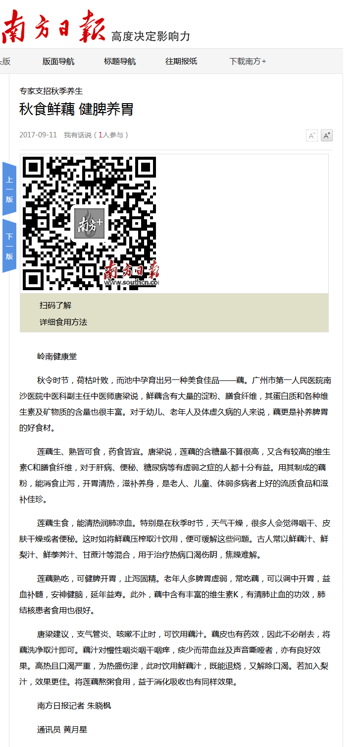 《南方日报》:秋食鲜藕,健脾养胃 2017年9月11日A09版